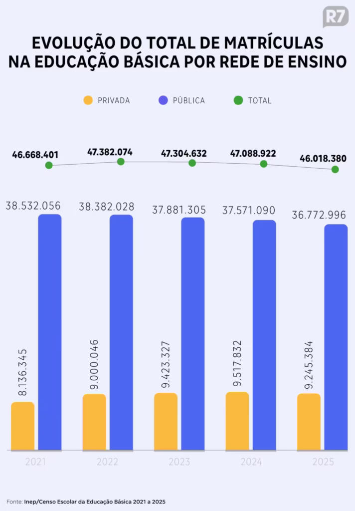 O número de matrículas na educação básica registrou queda de 1,07 milhão de registros em um ano no Brasil, segundo dados do Censo Escolar. Entre 2024 e 2025, a rede pública teve redução de 2,1% no número de estudantes, enquanto essa taxa foi de 2,9% nas instituições privadas.