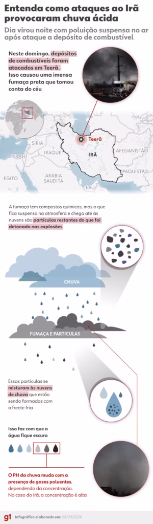 Um ataque a um depósito de combustíveis em Teerã neste domingo (8) provocou uma grande coluna de fumaça que escureceu o céu da capital iraniana e levou autoridades a emitir um alerta para o risco de chuva ácida na região.