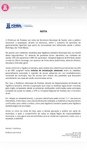 Conforme observou o ClickPB, casos de intoxicação começaram a ser registrados, de forma repentina, na noite do domingo (15). Relatórios recebidos pela Vigilância Sanitária de Pombal registram a entrada de 33 pacientes na Unidade de Pronto Atendimento (UPA) e 51 no Hospital Regional de Pombal (RCP) com sintomas semelhantes.