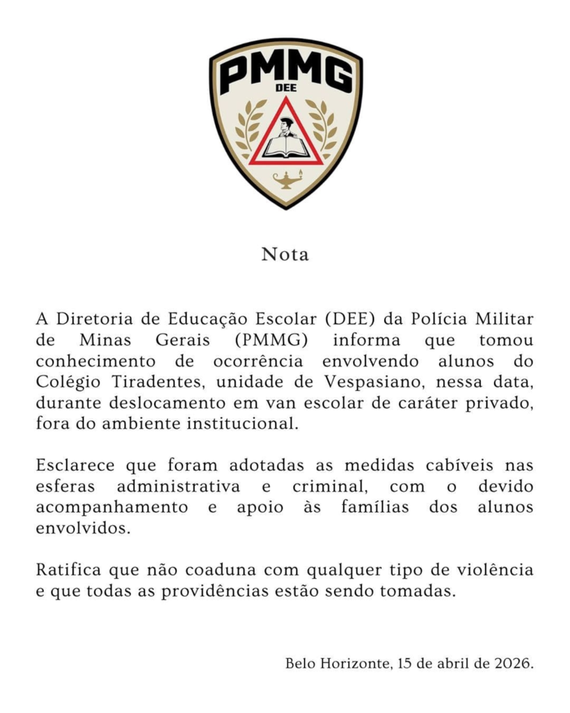 Em nota, a DEE-MG informou que tomou conhecimento da ocorrência envolvendo alunos do Colégio Tiradentes, da unidade de Vespasiano, e que “as medidas cabíveis foram adotadas”.