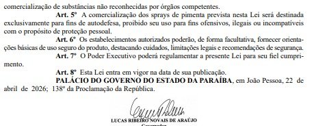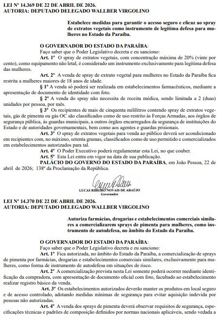 O governador Lucas Ribeiro (PP) sancionou, nesta quinta-feira (23), uma lei que autoriza a venda de spray de pimenta por farmácias e drogarias, exclusivamente para mulheres, como forma de instrumento de autodefesa em situações de risco. O texto de autoria do deputado Wallber Virgolino foi publicado no Diário Oficial do Estado (DOE).